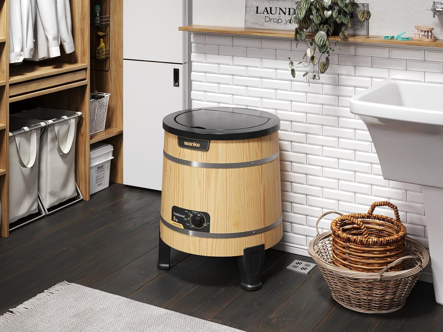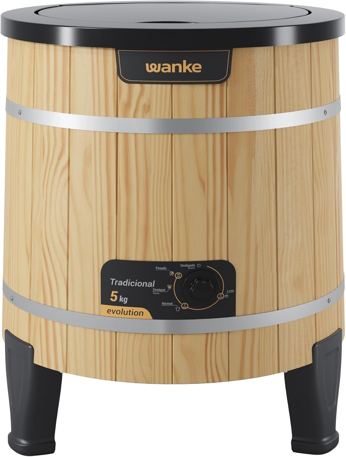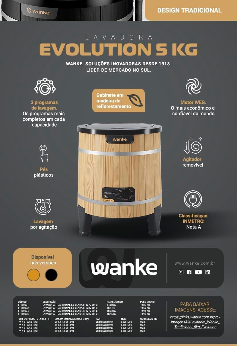 A Lavadora TRADICIONAL da Wanke tem mais de 50 anos de TRADIÇÃO e com a INOVAÇÃO destes últimos tempo, vem satisfazendo as donas de casa. Com um design retrô, a lavadora tem gabinete confeccionado em madeira proveniente de reflorestamento, tratada com impermeabilizante e revestida com verniz natural, o seu painel quanto o tanque interno são em polipropileno, que impedem o contato da água com a madeira. Ideal para a lavagem de roupas muito sujas, com um agitador em formato de pás, os relevos no gabinete interno ajudam no processo de lavagem, movimentando muito mais as roupas durante a lavagem, removendo toda a sujeira , com capacidade para 5kg sendo semiautomática possuindo pés emborrachados, que se adaptam a qualquer tipo de piso.