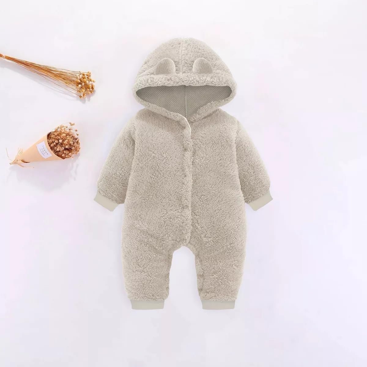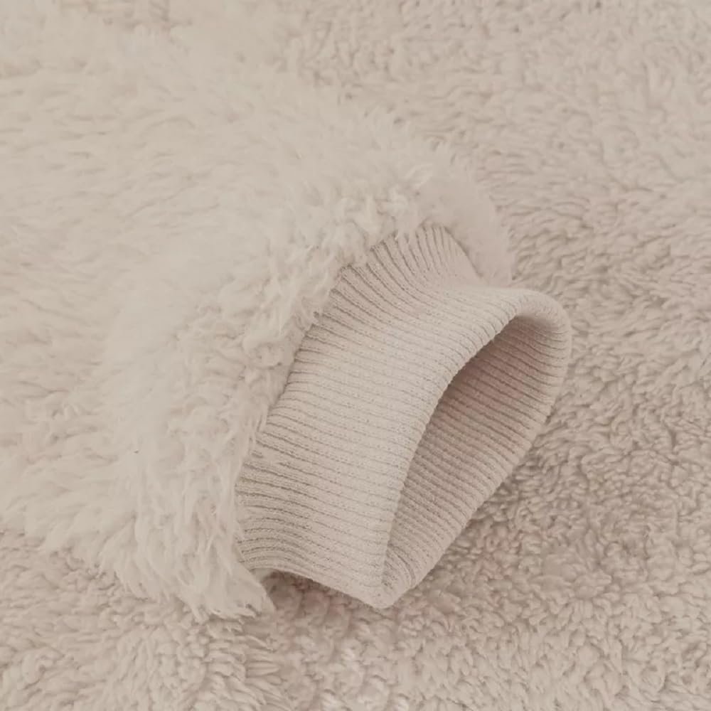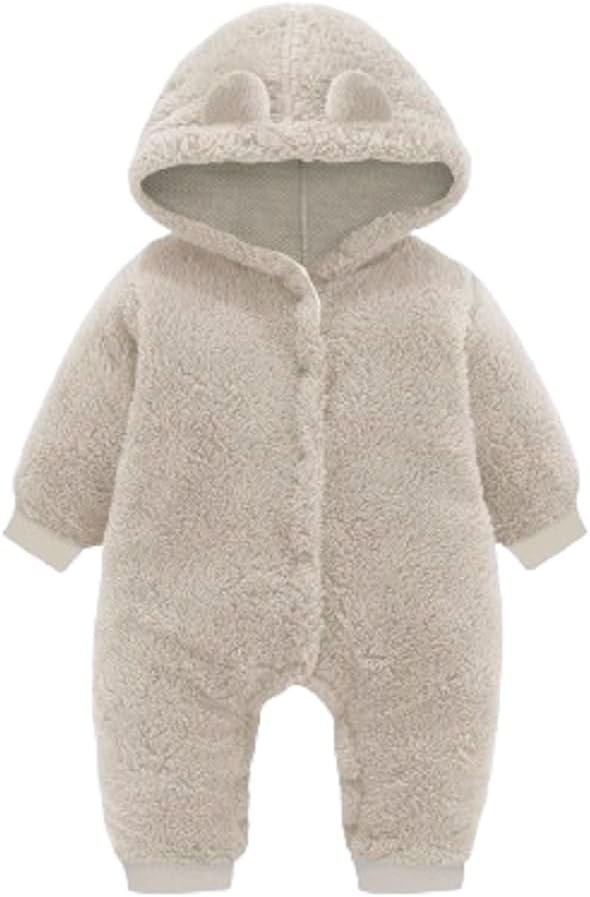 Macacão para Bebês Manga Longa Pelúcia Teddy Pele de Carneiro Frio com Capuz e Orelhinhas Unissex Creme