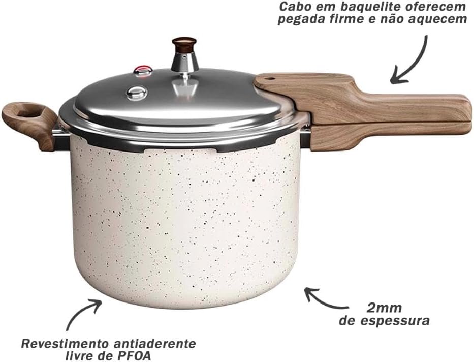 Como Usar: Adicione os ingredientes, feche corretamente e leve ao fogo. Aguarde a pressão subir, cozinhe e libere o vapor com segurança.