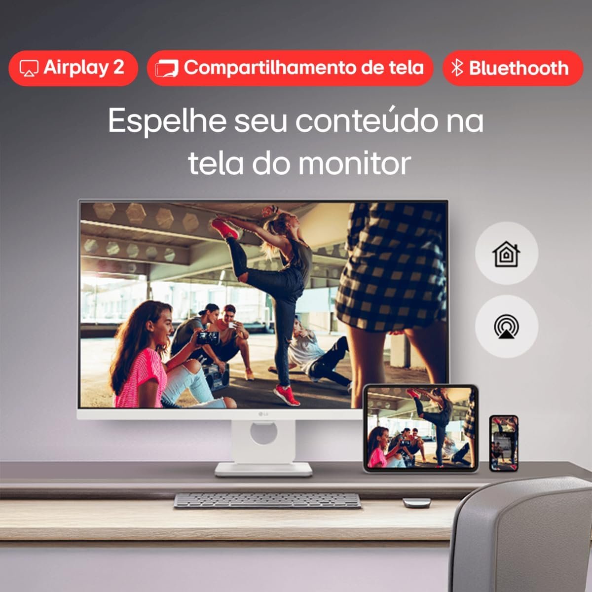Espelhe seus conteúdos na tela do monitor: Compartilhe o conteúdo do seu smartphone para o seu monitor com AirPlay 2* (para dispositivos Apple) ou Screen Share** (para dispositivos Android). Aproveite também um som envolvente com a conexão Bluetooth e Wi-fi.