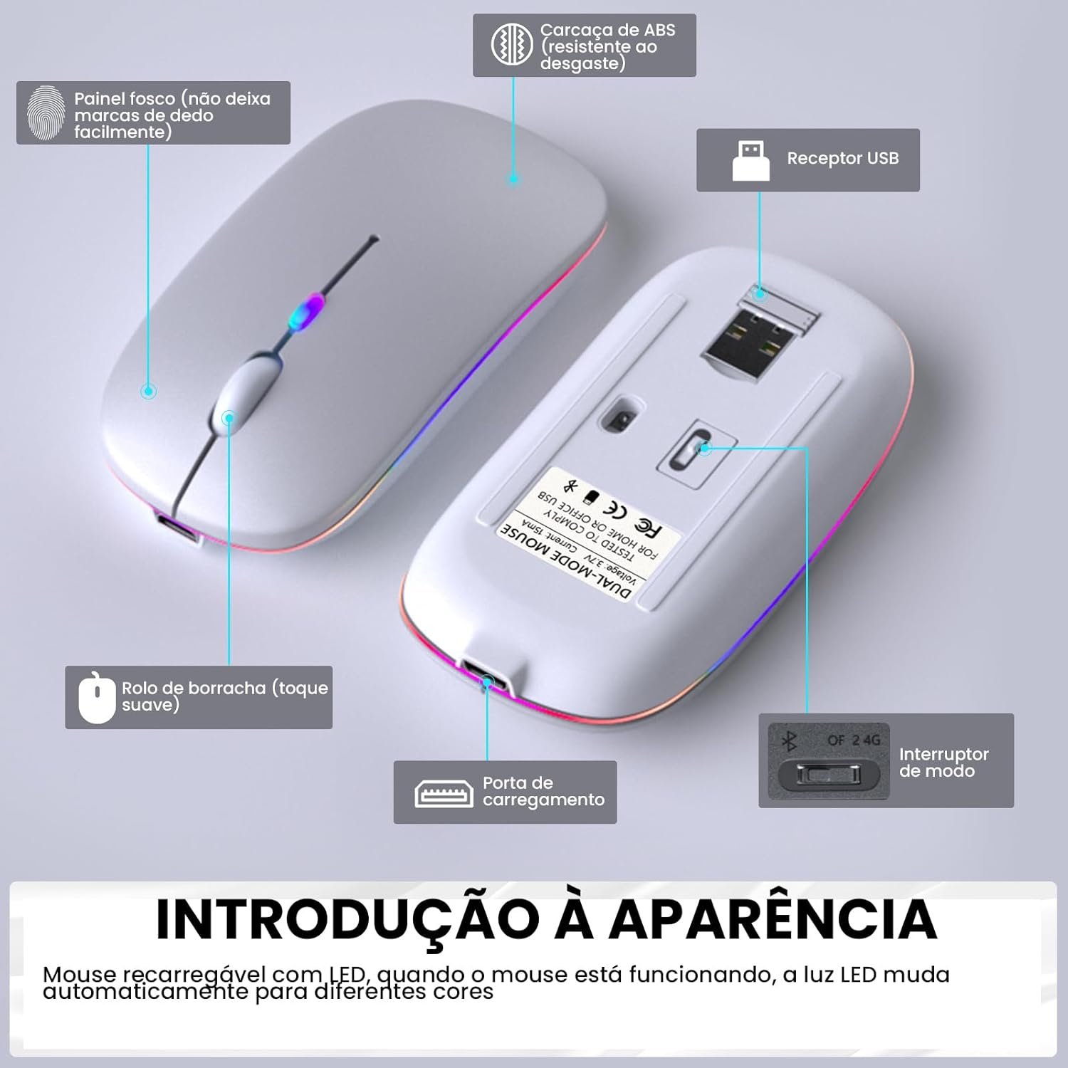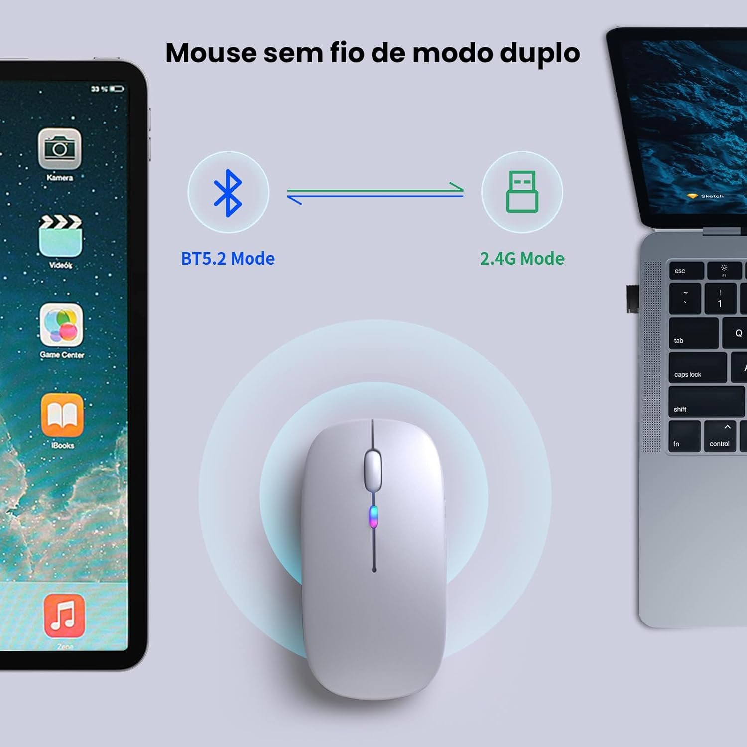 Mouse Sem Fio Recarregável com Led RGB, Design Ergonômico, Conexão Dual Bluetooth 5.0/USB 2.4GHz, DPI Ajustável, para Notebook, PC, Desktop, Laptop e TV Smart, Silencioso, Qualidade