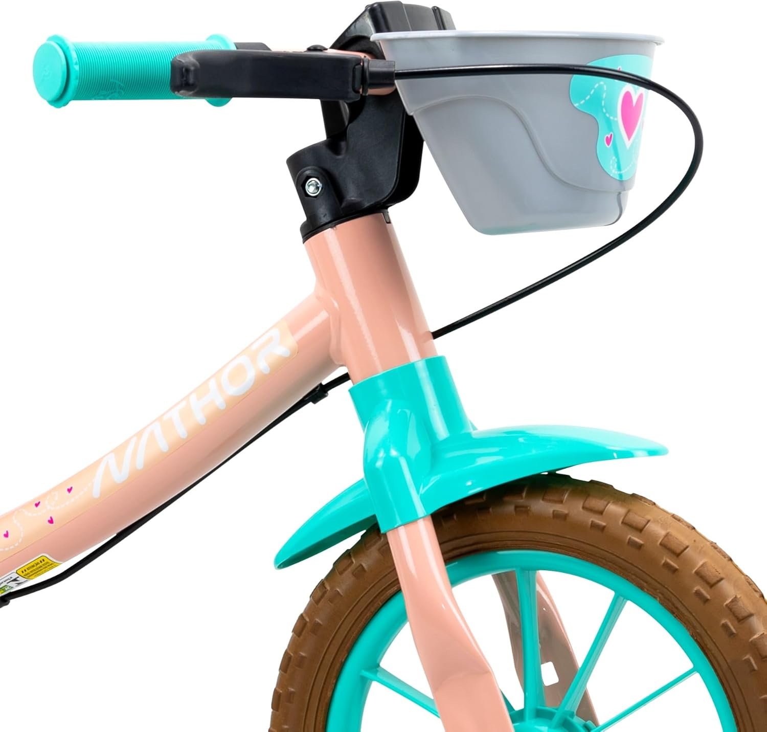 SEGURA E DIVERTIDA: A bicicleta Balance Nathor conta com limitador de giro do guidão (garantindo mais segurança), pneus em E.V.A. (mais leves e antiderrapantes), freio traseiro a tambor e regulagem de altura do selim de PU.