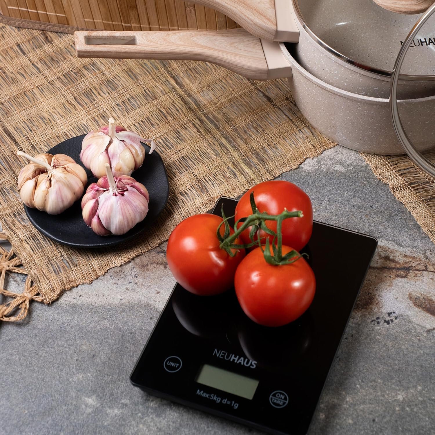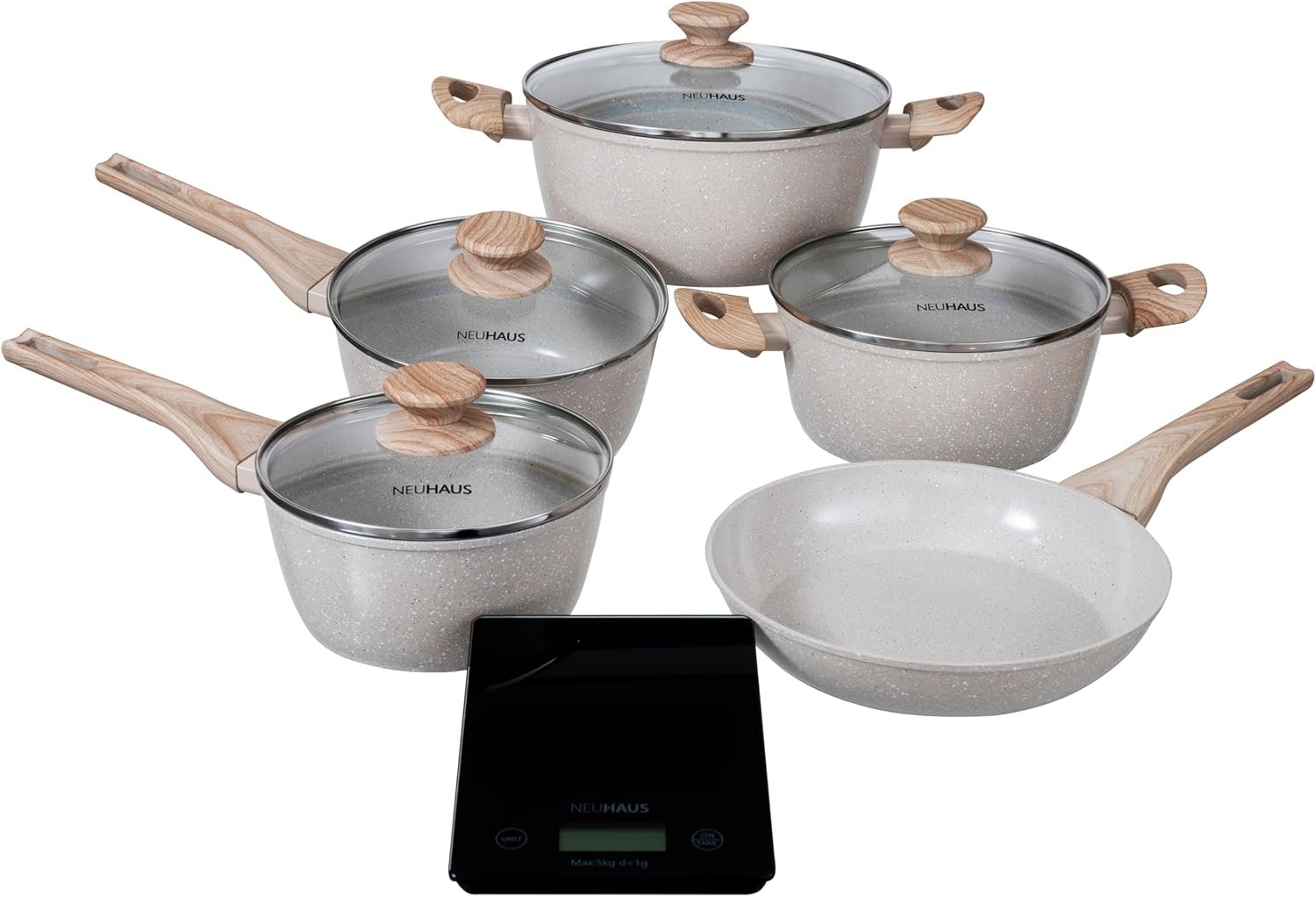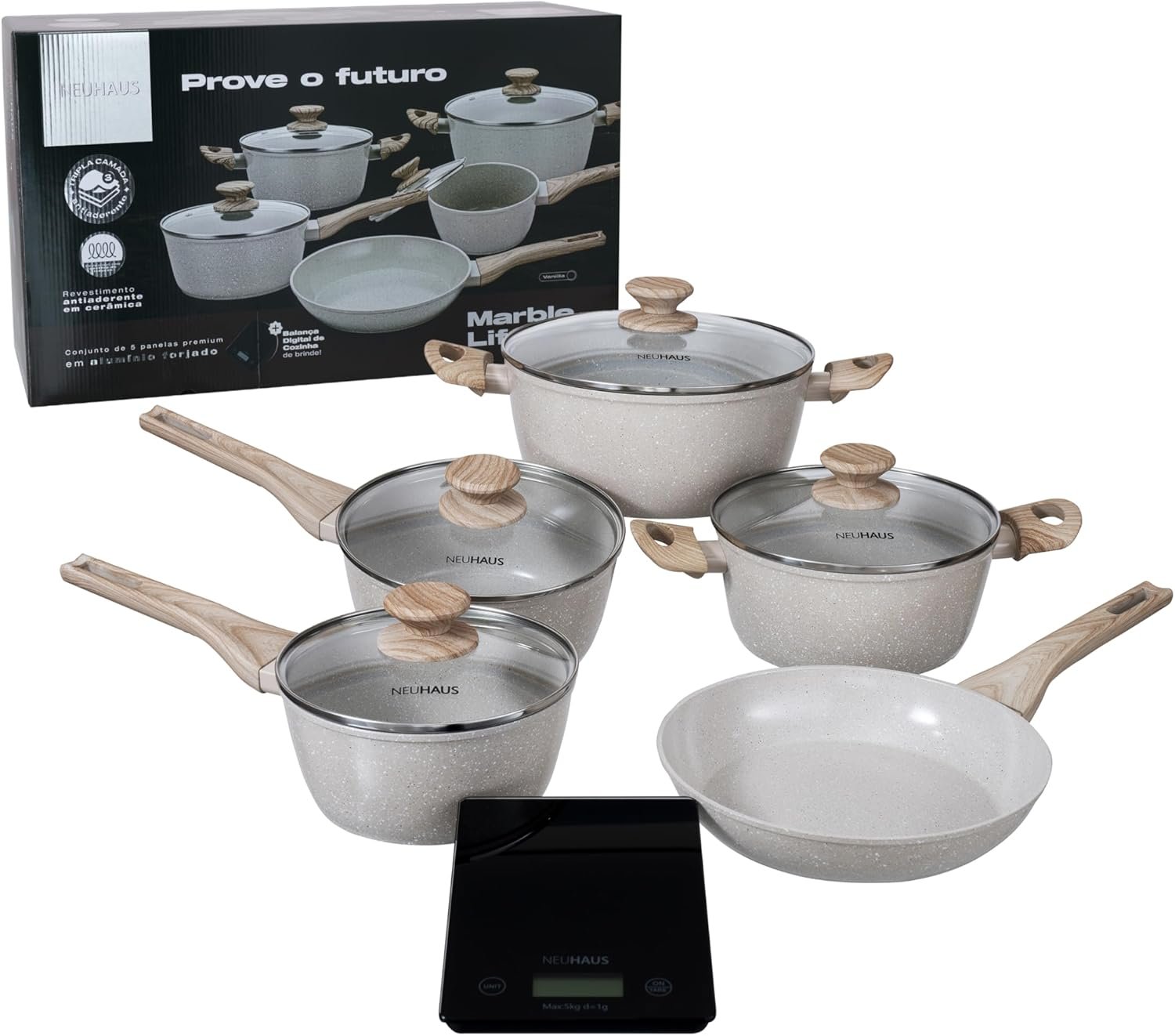 NEUHAUS Jogo de Panelas 5 Peças com Revestimento Cerâmico + Balança Digital Marble Life – Vanilla