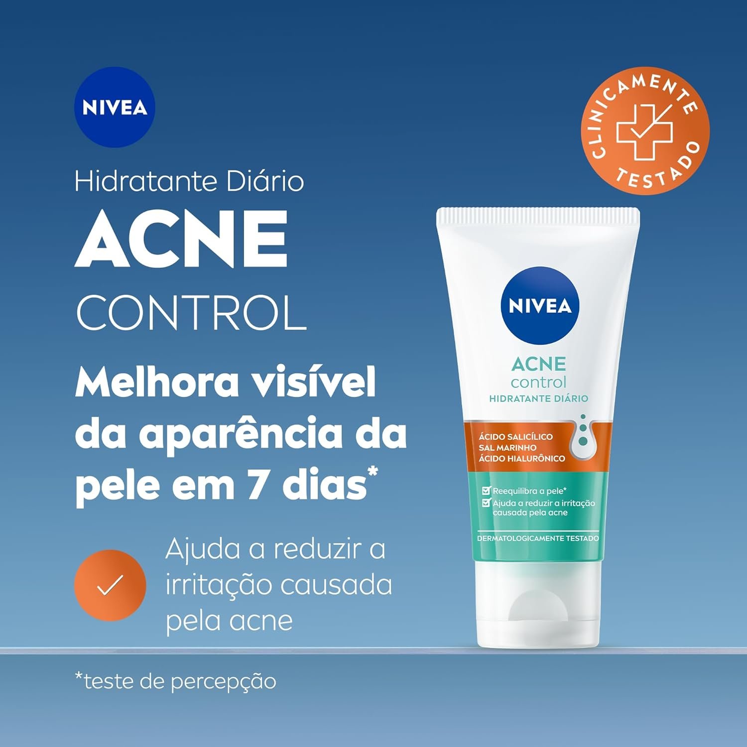 “O que é? Nova linha de Acne Control da NIVEA apresenta este hidratante facial que reduz a acne e melhora visível da aparência da pele em apenas 7 dias. Ajuda a reduzir a irritação causada pela acne. Para que serve o NIVEA Hidratante Facial Acne Control? Reduz a acne e ajuda a reequilibrar a pele de 5 maneiras: 1. Ajuda a combater 99% da bactéria causadora da acne**; 2. Controla a oleosidade e proporciona efeito matte; 3. Com ácido salicílico que ajuda a remover células mortas; 4. Ajuda a reduzir a vermelhidão da acne 5. Sensação de pele hidratada. Benefícios e diferenciais Ajuda a combater 99% da bactéria causadora da acne** Ajuda a reduzir a irritação causada pela acne Sal marinho 99% puro Ácido Salicílico: ajuda a remover células mortas Extrato de Alcaçuz Dourado e Magnólia Carnitina: ajuda a controlar a oleosidade Ácido Hialurônico: ajuda na hidratação da pele Como usar o NIVEA Hidratante Facial Acne Control? USO DIÁRIO Aplique diariamente no rosto limpo. Utilize duas vezes ao dia. CUIDADO: Evite contato com os olhos. Uma unidade de embalagem contém 50ml **bactéria testada: Cutibacterium acnes”