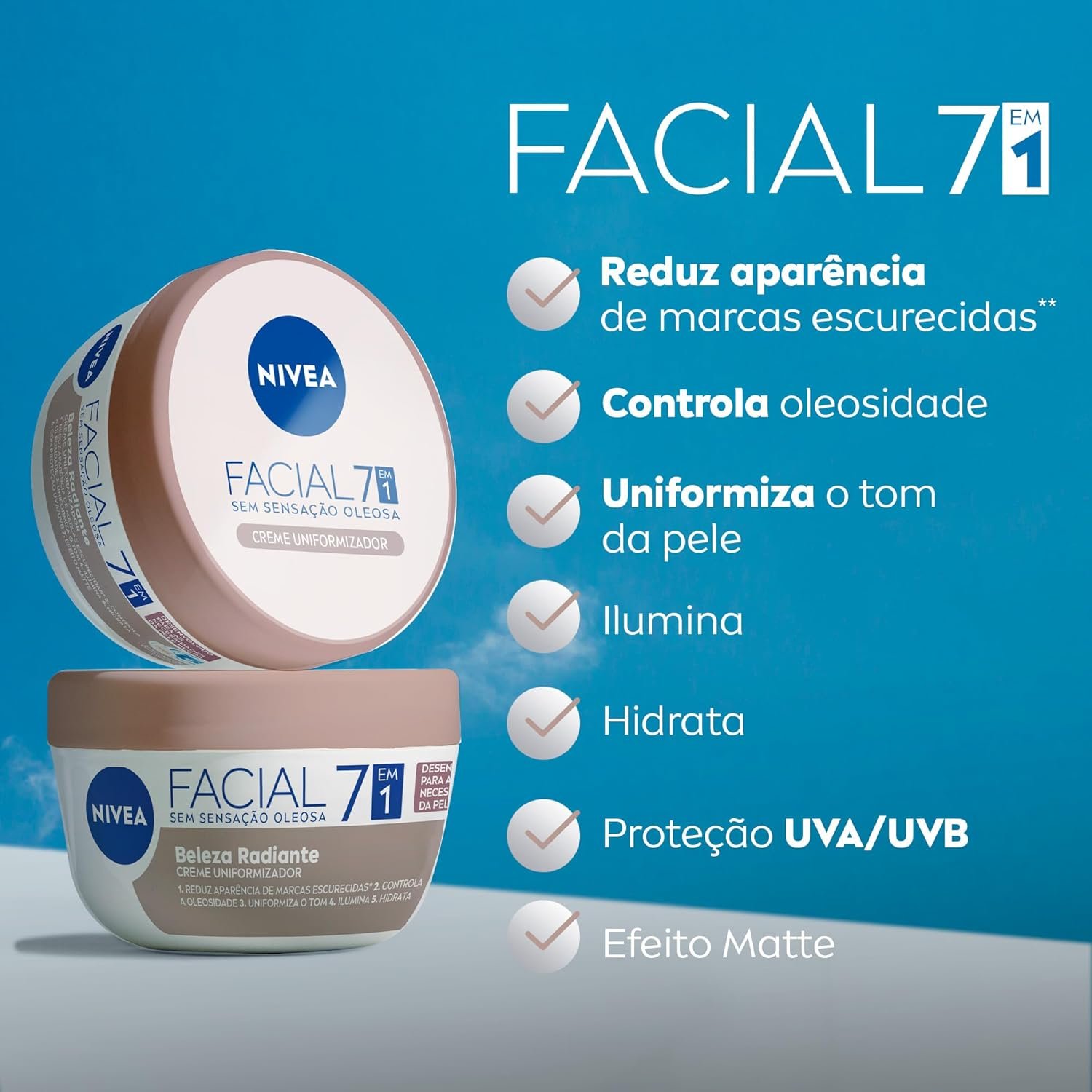 NIVEA Hidratante Facial Beleza Radiante 7 em 1 100g – 7 benefícios em 1 potinho: reduz marcas escurecidas, controla oleosidade, uniformiza, ilumina, hidrata, proteção UVA/UVB e efeito matte