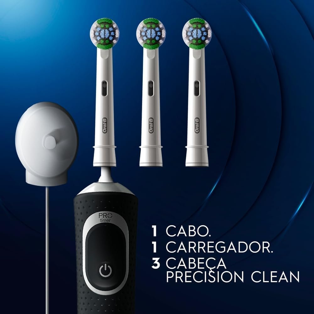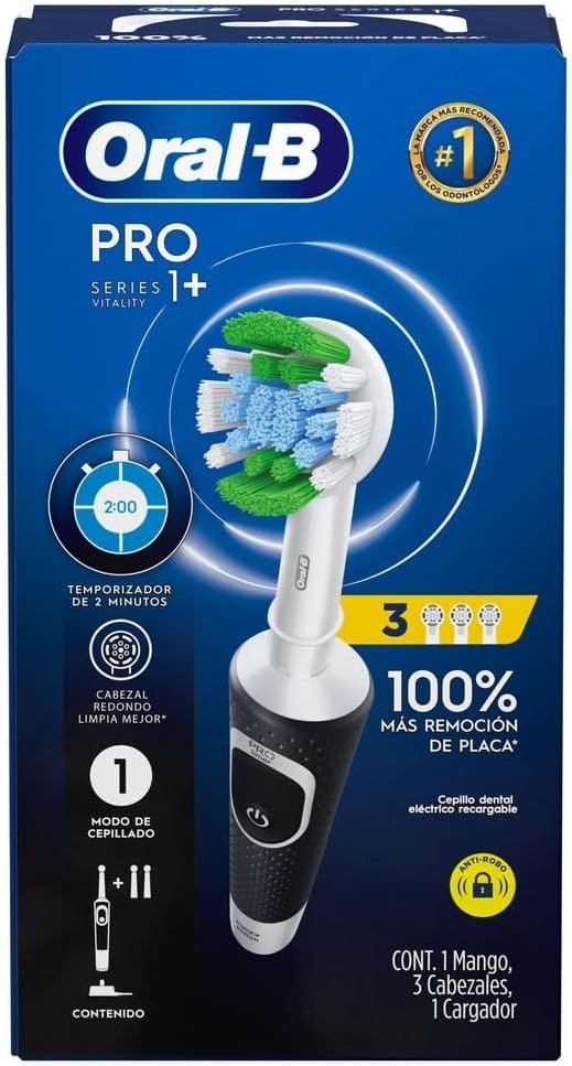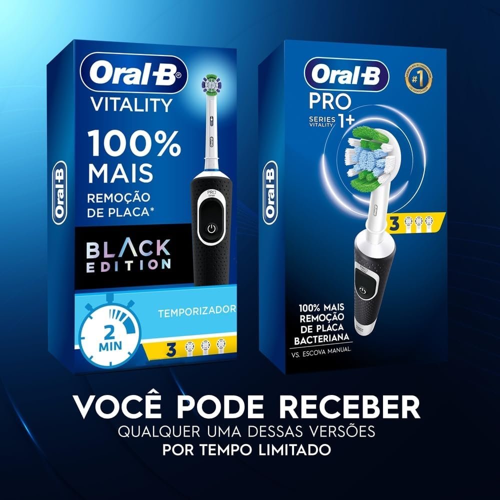 Use a Escova de Dentes Elétrica exclusiva Oral B Vitality 100+ com a qual você terá 100% mais remoção de placa * (* vs. escova de cerdas retas) graças ao seu design especial com cabeça redonda que proporciona limpeza superior. Além disso, está escova elétrica possui sua estação de carregamento e um temporizador que ajuda você a escovar os dentes por 2 minutos, recomendada por especialistas em saúde bucal.