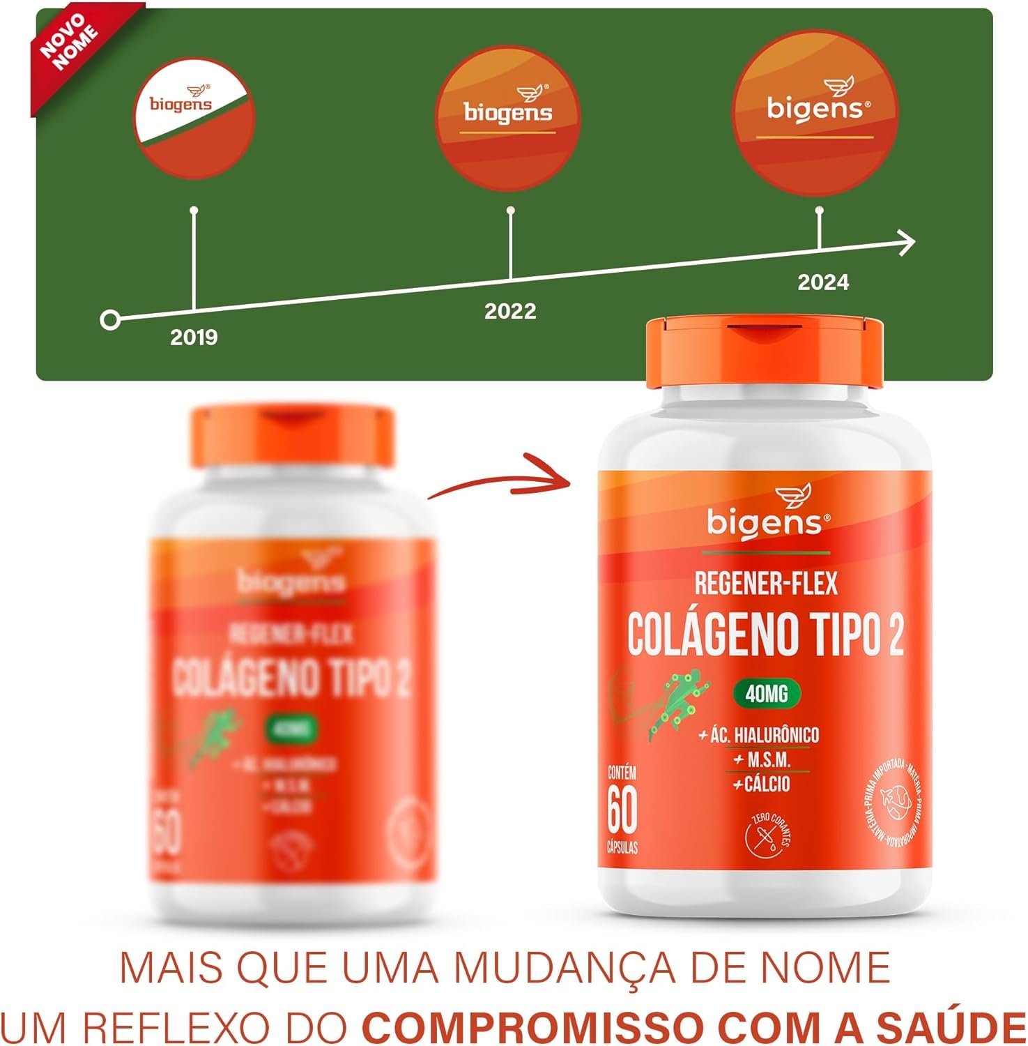Regener Flex, Colágeno tipo 2 40mg, ácido hialurônico, M.S.M., Cálcio, 60 cápsulas, Biogens