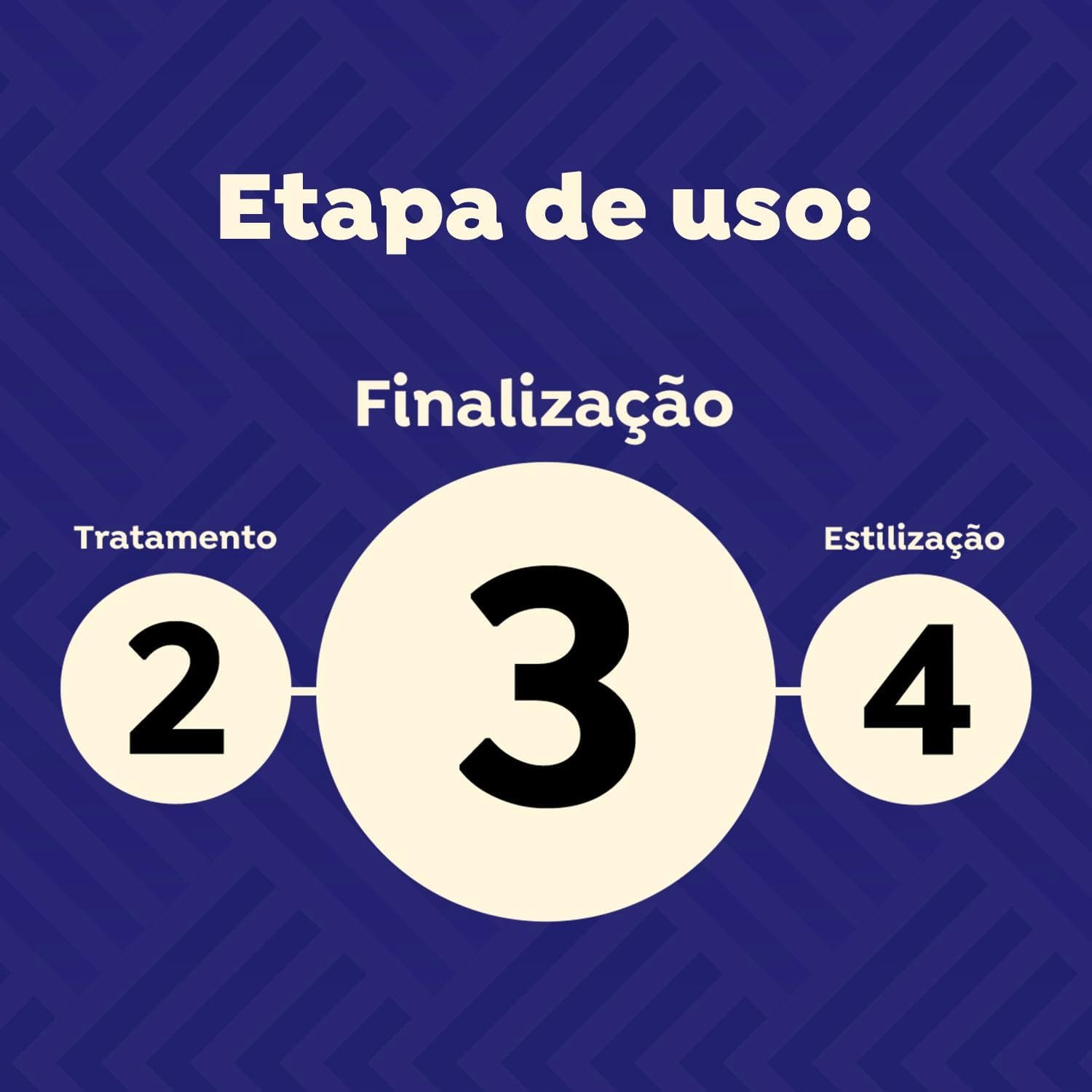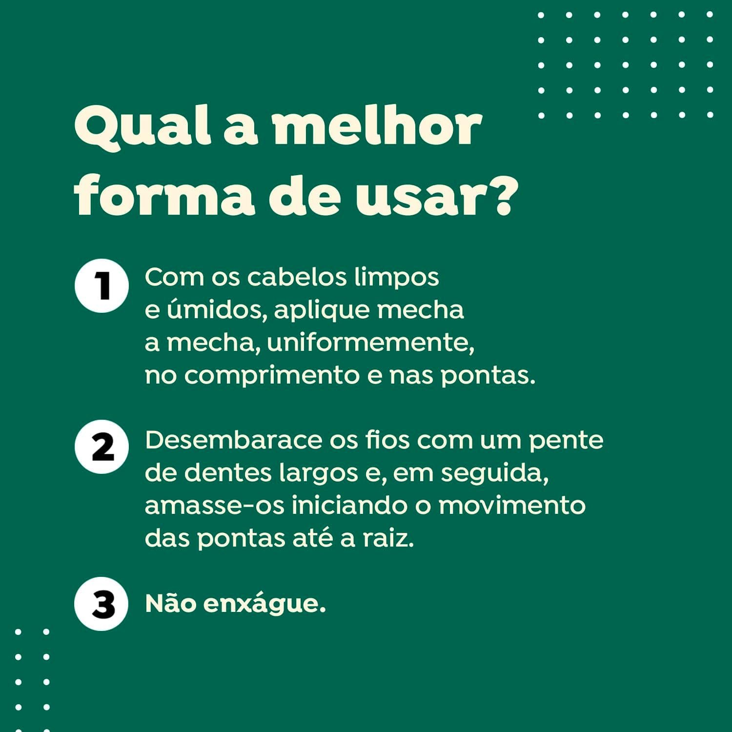 MODO DE USO. Com os cabelos limpos e úmidos, aplique o creme de pentear mecha a mecha, uniformemente, no comprimento e pontas. Desembarace os fios com um pente de dentes largos e amasse-os, iniciando o movimento das pontas até a raiz. Não enxágue.