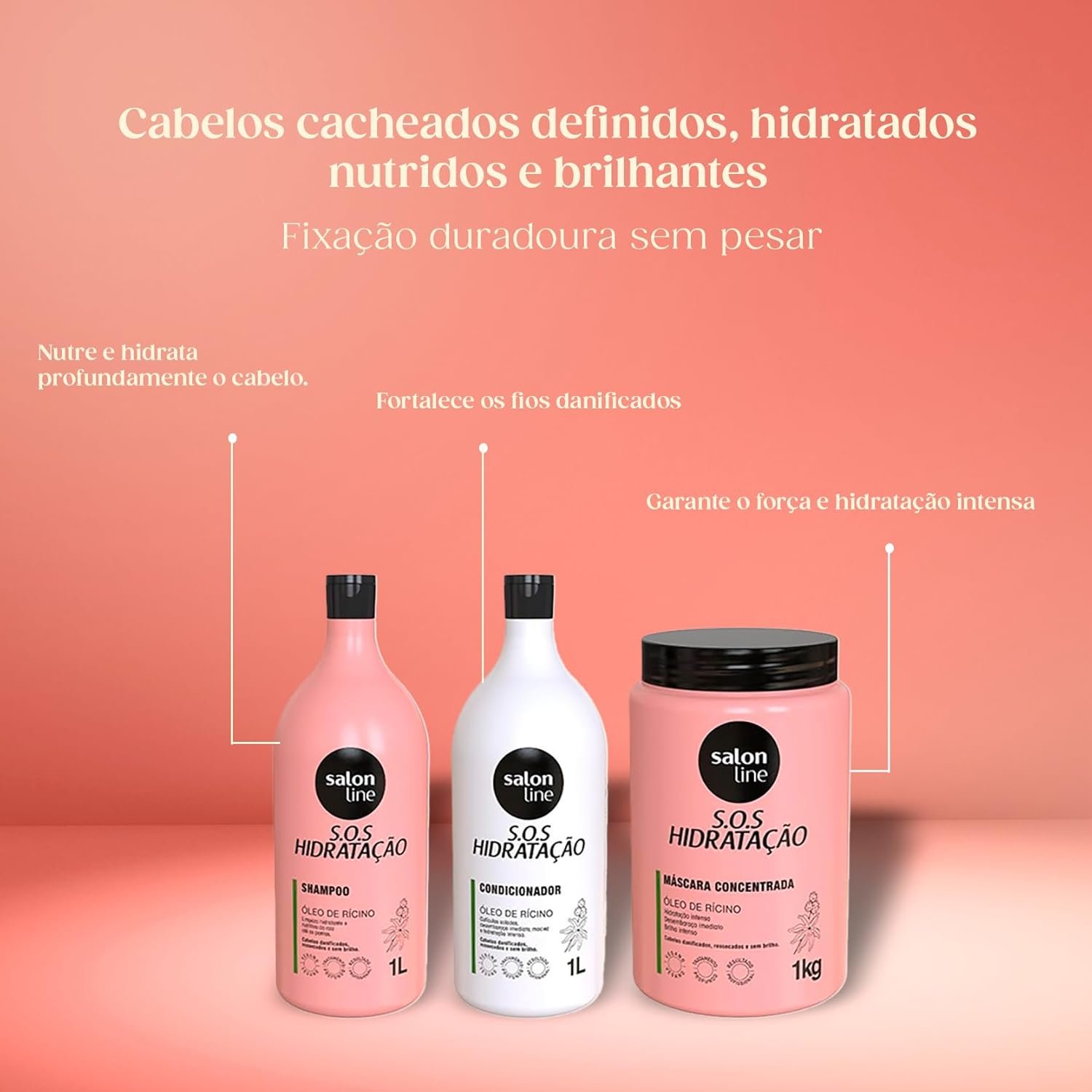 Hidratação profunda garantida! O Kit S.O.S Hidratação Turbinado conta com o Shampoo e o Condicionador S.O.S Hidratação Turbinada com fórmula poderosa e ultra concentrada para nutrir e hidratar os cabelos. Além disso, traz a Máscara S.O.S Hidratação Turbinada para a saúde e o brilho dos fios. Contém: – Manteiga de karité: hidrata e nutre profundamente o cabelo. – Óleo de rícino: tem ação intensiva nas fibras capilares, fortalecendo os fios danificados. – Azeite de oliva: poderoso antioxidante, garante o força e hidratação intensa. Indicado para o tratamento de cabelos danificados, ressecados e sem brilho. Modo de usar: Aplique o shampoo no cabelo úmido e massageie. Enxágue. Se necessário, repita a aplicação. Aplique o condicionador no cabelo úmido e massageie. Enxágue. Se necessário, repita a aplicação. Após lavar os cabelos, retire o excesso de água e aplique a máscara capilar do comprimento até as pontas. Aguarde 3 minutos e enxágue. Finalize como desejar. Produtos não veganos. Uso recomendado a partir de 12 anos. Salon Line: produtos que valorizam sua beleza única, em cada momento da sua jornada capilar.