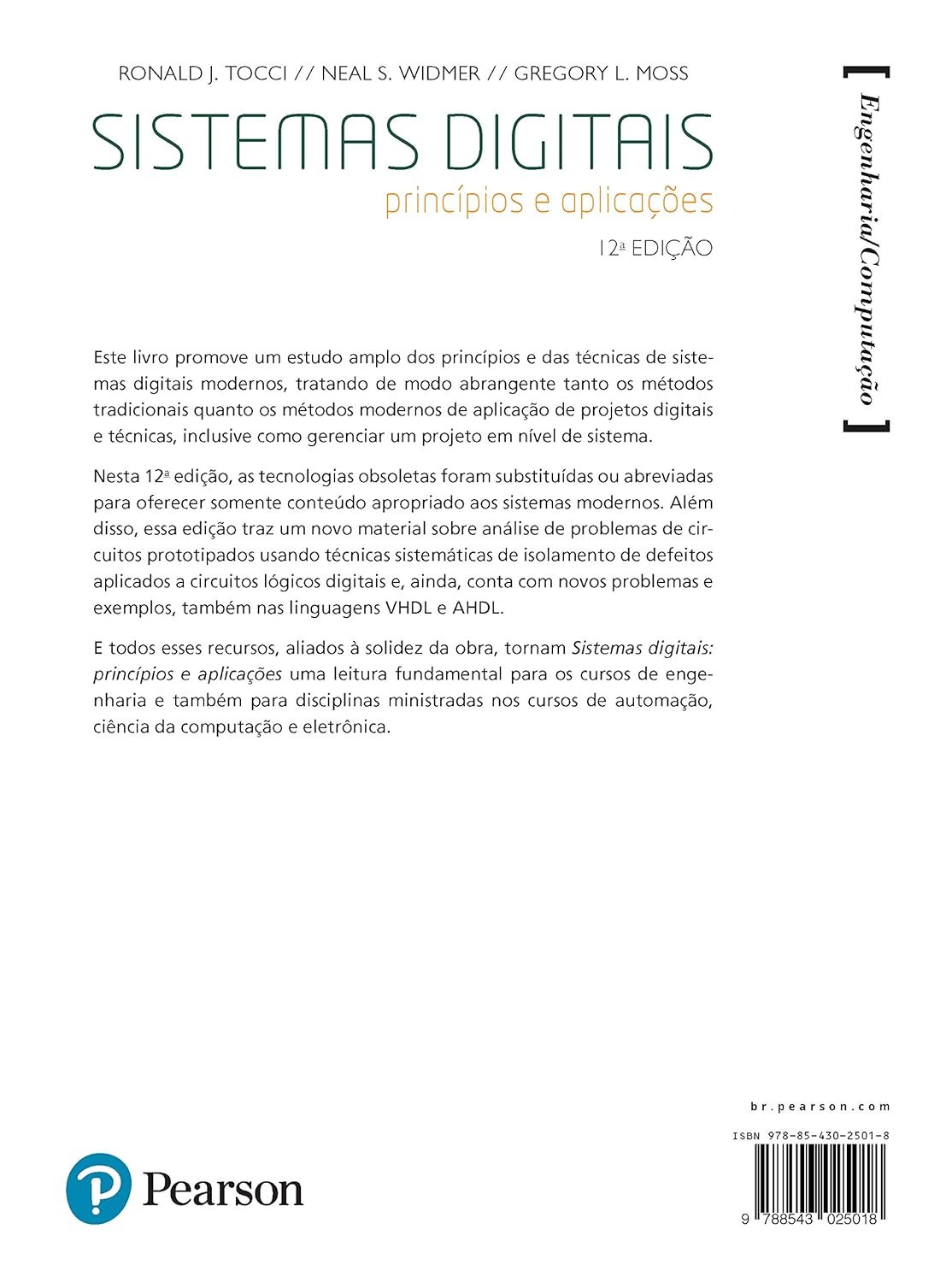 Este livro promove um estudo abrangente dos princípios e técnicas de sistemas digitais modernos. Além de ensinar os fundamentos do tema, cobre em detalhes tanto métodos modernos quanto tradicionais de aplicação de projetos digitais e técnicas de desenvolvimento, inclusive como gerenciar um projeto em nível de sistema. Nesta 12ª edição tecnologias obsoletas foram substituídas ou abreviadas para oferecer somente conteúdo apropriado aos sistemas modernos. O Capítulo 1 foi extensivamente revisado e atualizado e novos problemas e exemplos foram adicionados em todo o livro. Sistemas digitais é leitura fundamental para cursos de engenharia, assim como para disciplinas ministradas nos cursos de automação, ciência da computação e eletrônica, entre outros.
