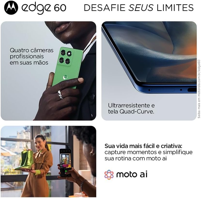 Você sabe a melhor maneira de se expressar. Conecte sua personalidade com o motorola edge 60. Tenha nas mãos um design projetado com precisão, em linhas curvas de visual arrojado e marcante. Tire fotos icônicas com quatro câmeras profissionais: principal, ultra-wide e frontal de 50 MP cada, e até uma lente teleobjetiva dedicada de 3x. Além disso, a moto ai simplifica a sua rotina e torna a sua vida mais criativa, ajudando a tirar fotos lindas e organizando suas notificações para deixar o dia a dia mais fácil e intuitivo. Ande por aí com um telefone resistente a quedas1, 2, temperaturas extremas2 e água3 sem perder a sofisticação. Veja a diferença na tela Super HD (1220p) de 6,7″, a mais brilhante da categoria⁵. Carregue a bateria para o dia inteiro em apenas 8 minutos4 com o TurboPower™ 68. E leve a vida no seu ritmo com o desempenho fluido, sem travamentos. Chegou o novo motorola edge 60. Desafie seus limites. O Smartphone Motorola Edge 60 5G é a escolha perfeita para quem busca desempenho e inovação em um único dispositivo. Com uma impressionante capacidade de armazenamento de 512 GB e 24 GB de RAM (12 GB + 12 GB de Ram Boost), você terá espaço de sobra para todos os seus aplicativos, fotos e vídeos. Seu processador Dimensity 7300, com velocidade de 2,5 GHz, garante uma experiência fluida, seja para jogos ou multitarefas. A tela Quad-Curve de 6,7 polegadas com tecnologia HDR10+ pOLED oferece cores vibrantes e uma resolução de 1220×2712, ideal para assistir a filmes e jogar. A taxa de atualização de 120 Hz proporciona uma navegação suave, enquanto a proteção IP68 e IP69 assegura que o dispositivo resista a água e poeira, tornando-o perfeito para aventuras ao ar livre. Capture momentos incríveis com a câmera traseira de 50 MP, que conta com estabilização inteligente e recursos como Night Vision e Adobe Scanner. A câmera frontal também possui 50 MP, permitindo selfies de alta qualidade. Com uma bateria de 5200 mAh e suporte para carregamento rápido, você pode ficar conectado por mais tempo sem se preocupar com a carga. O Motorola Edge 60 5G é um smartphone robusto e elegante. Com recursos como reconhecimento facial, leitor de impressão digital e conectividade 5G, ele atende às necessidades dos usuários mais exigentes. Experimente a combinação perfeita de tecnologia e design com o Motorola Edge 60.