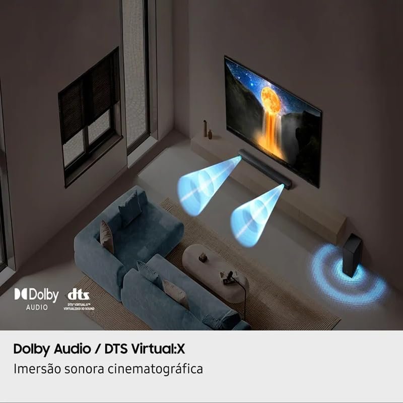 Imersão sonora cinematográfica. Dolby Audio / DTS Virtual:X. O Dolby Audio e DTS Virtual:X criam um som 3D que preenche seu ambiente, por meio de processamento de áudio de ultima geração.