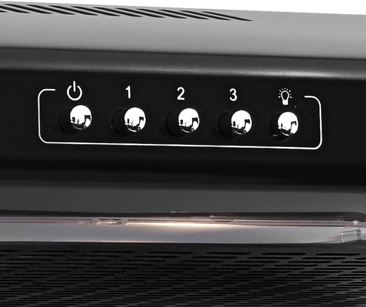 Depurador de Ar Slim com Manta Preto 60cm 3 velocidades Grande capacidade de sucção 390m³/h Luminária Dupla filtragem: Manta filtrante: elimina gordura e fumaça; filtro de carvão ativado: elimina odores indesejados Potência: 130W Baixo consumo: 0,13kWh Indicado para fogões de 4 bocas