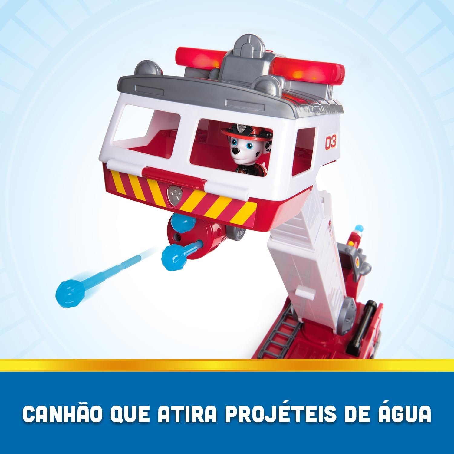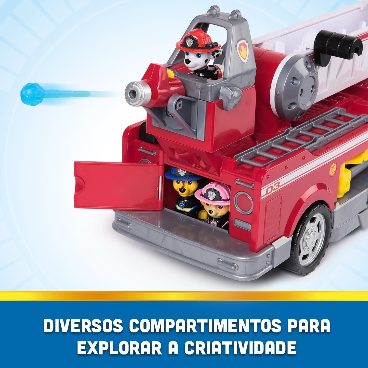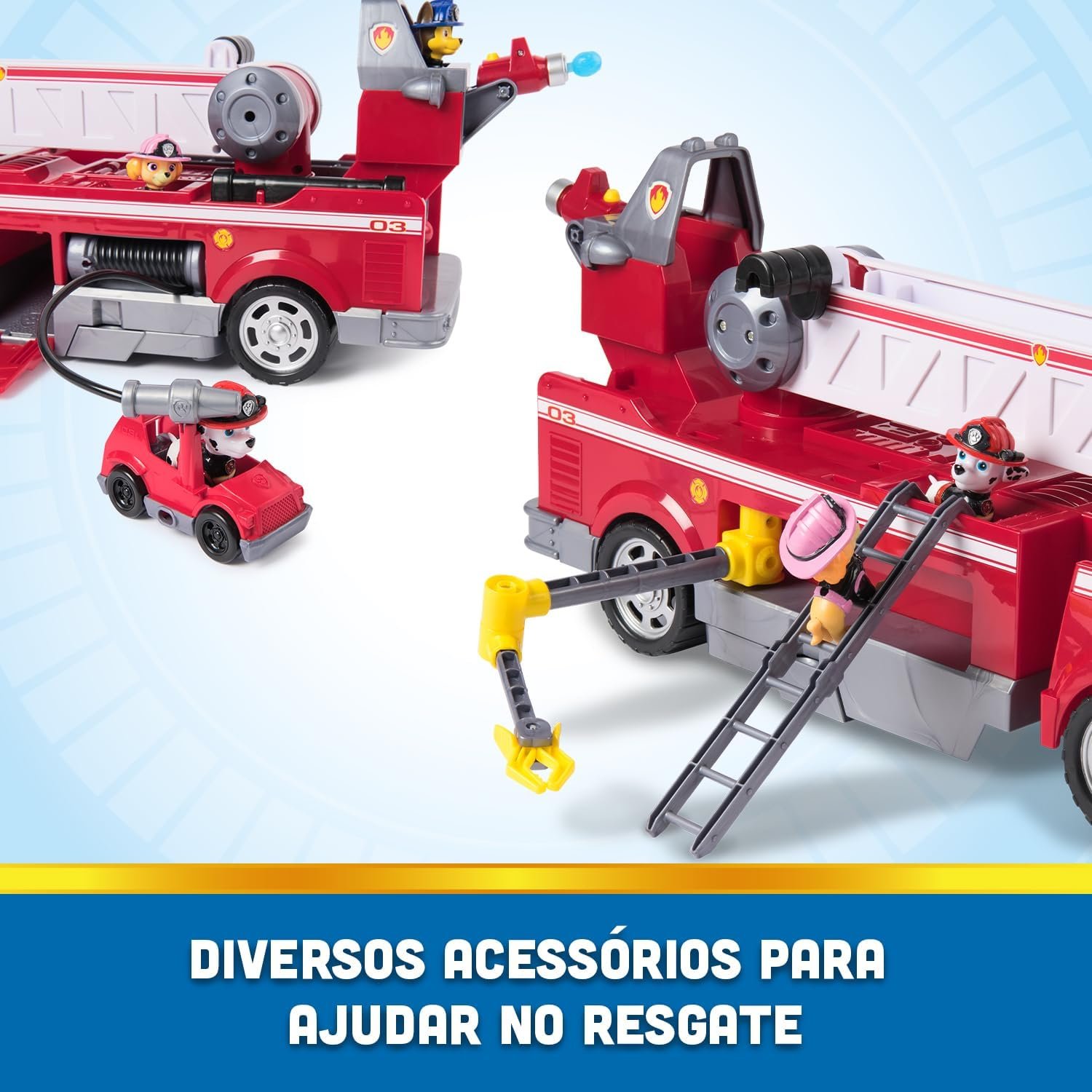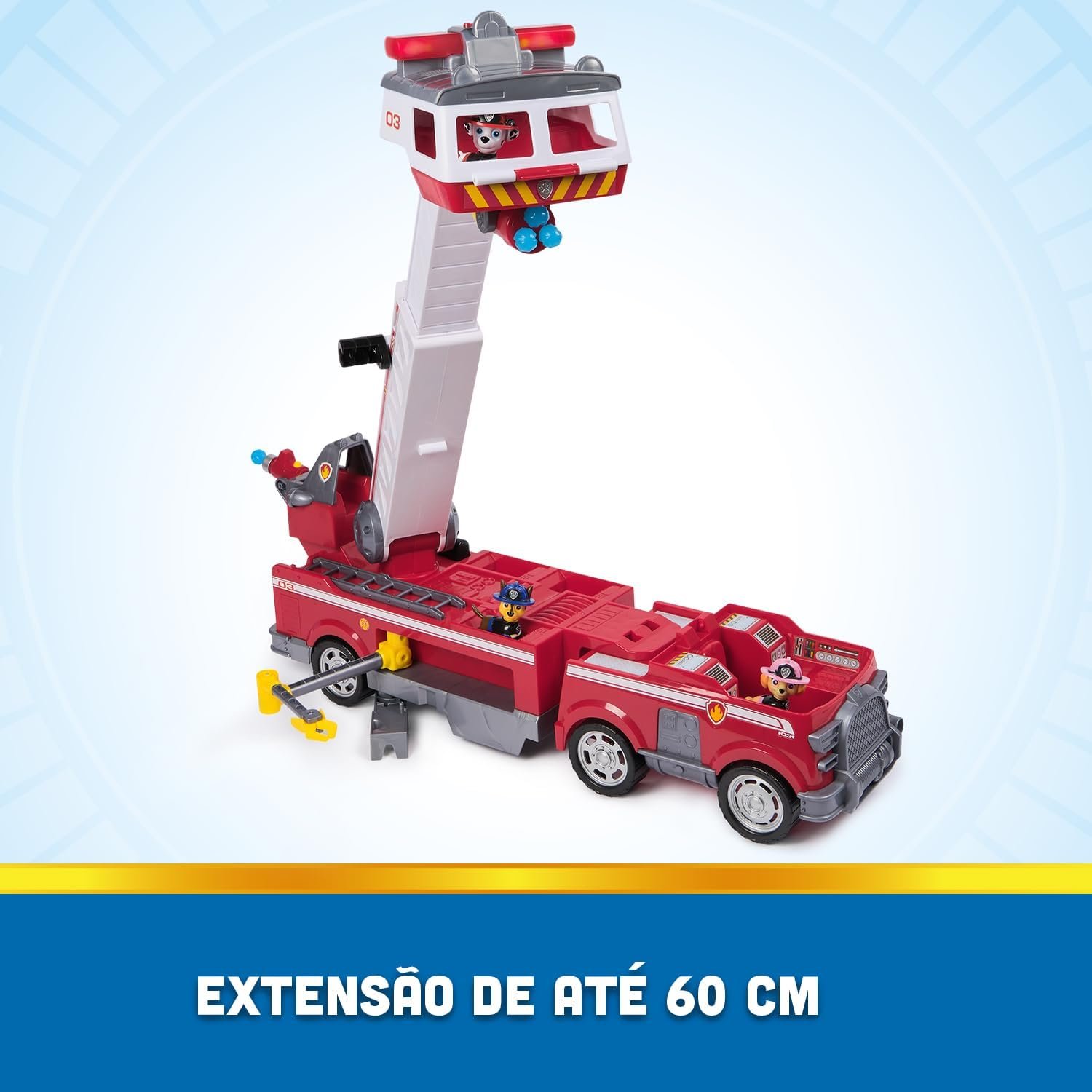 SOBRE O CONJUNTO. Veículo com escada extensível de 60 cm, luzes e sons ativados ao levantar e puxar. Inclui figuras de Marshall, Chase e Skye, mini carrinho e canhões de água.
