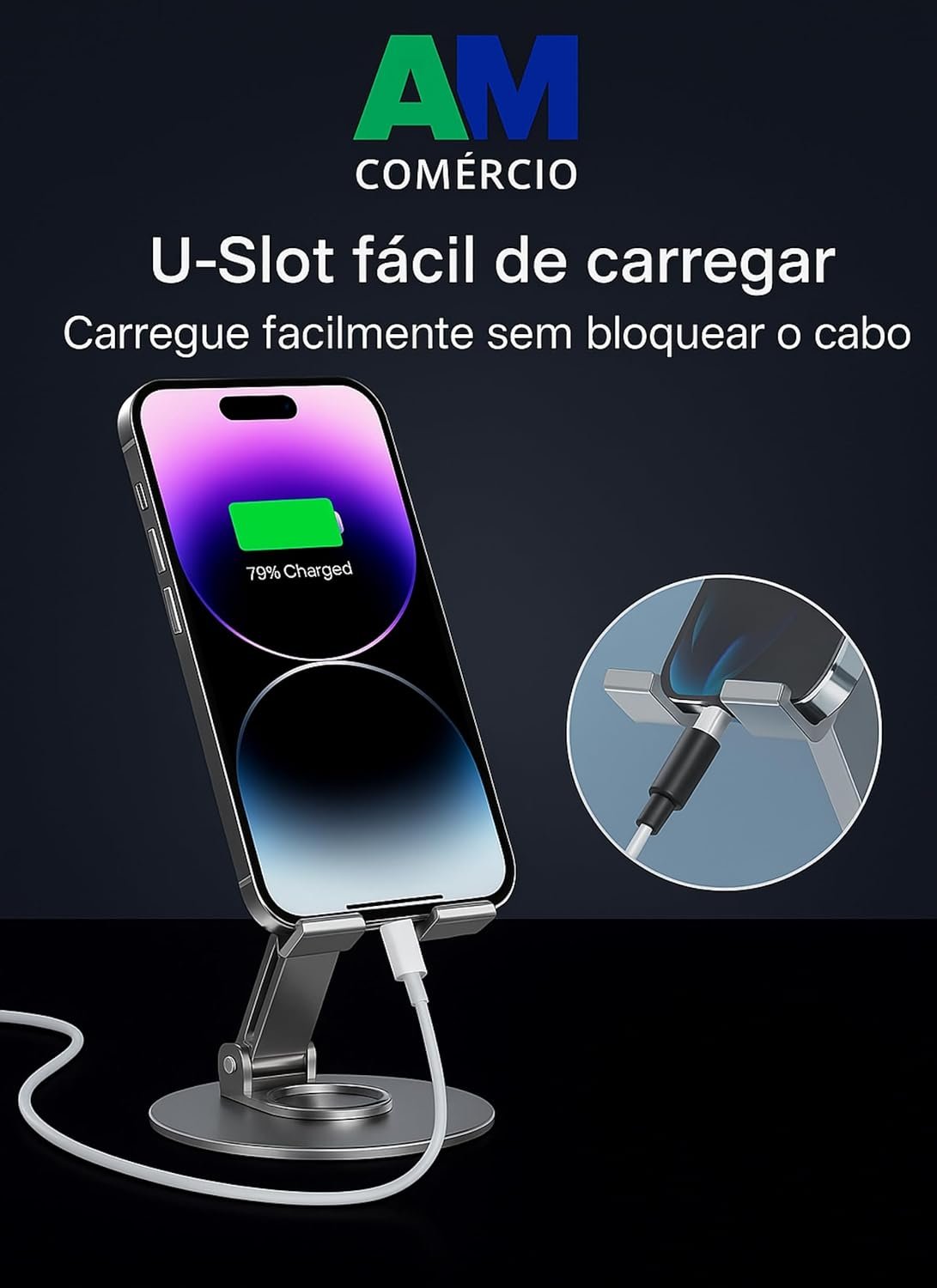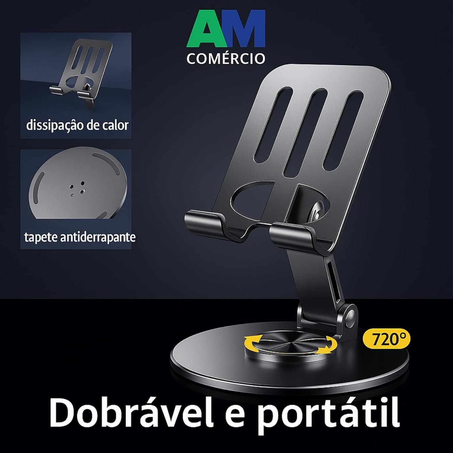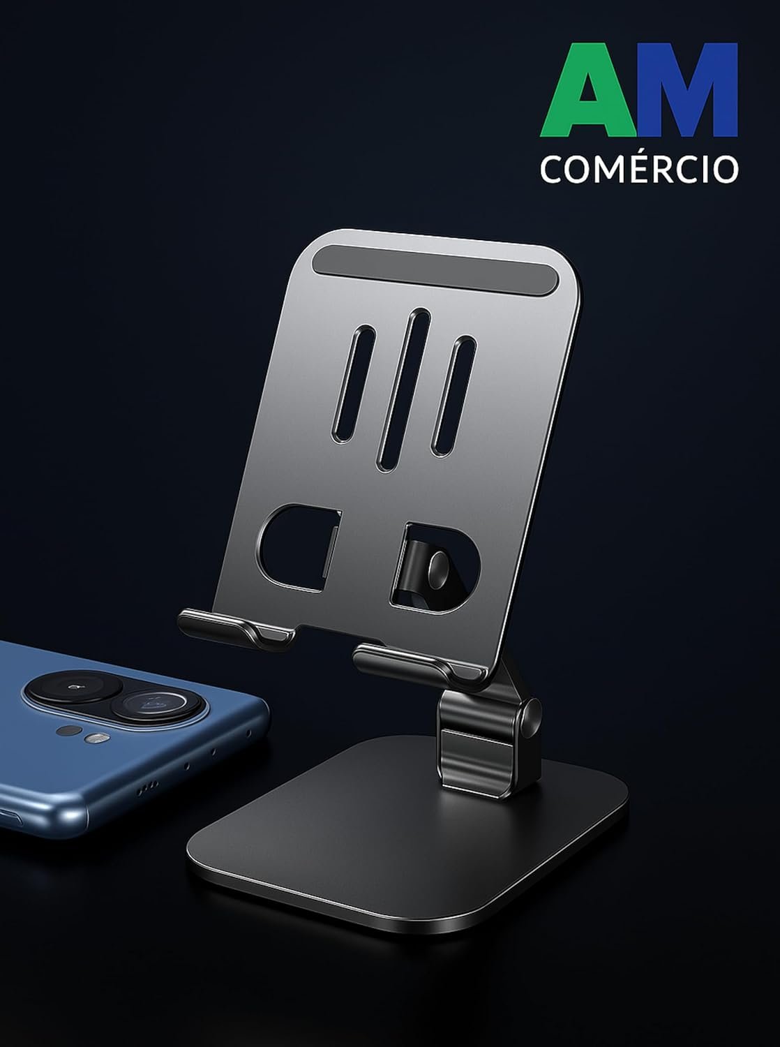 Produzido em alumínio premium, combina leveza com resistência. Possui base metálica ponderada com almofadas de silicone antiderrapantes, garantindo estabilidade sem causar danos às superfícies. Conta ainda com um orifício para passagem de cabos, possibilitando o carregamento enquanto em uso. Portabilidade e Praticidade – Dobrável, leve (200g) e compacto, o suporte é fácil de transportar em bolsas ou mochilas. Seu design moderno combina com qualquer ambiente, sendo ideal para uso em casa, no escritório ou em viagens.