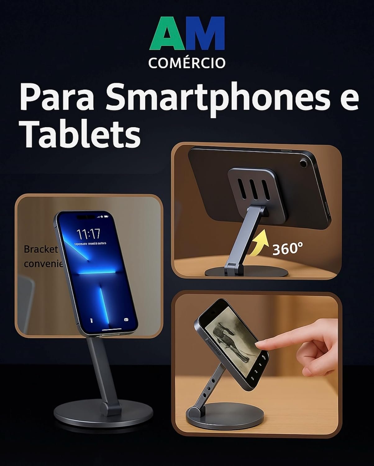 Compacto e elegante, ocupa pouco espaço na mesa, mantendo o ambiente organizado e funcional. Compatível com a maioria dos smartphones disponíveis no mercado, este acessório essencial é perfeito para uso em casa, no escritório ou em qualquer ambiente de trabalho, combinando praticidade e funcionalidade para otimizar sua experiência com dispositivos móveis. Conforto e Versatilidade – Compatível com smartphones, tablets e iPads de até 7 polegadas, este suporte é perfeito para lives, videochamadas, assistir filmes, leitura, jogos ou até mesmo cozinhar enquanto segue receitas.Oferece uso tanto na posição vertical quanto horizontal, permitindo o ajuste de ângulo para maior conforto e redução de tensões no pescoço e ombros. Design Durável e Funcional.
