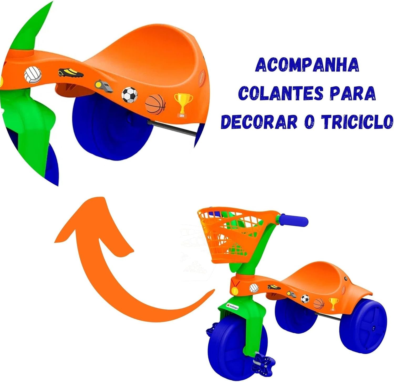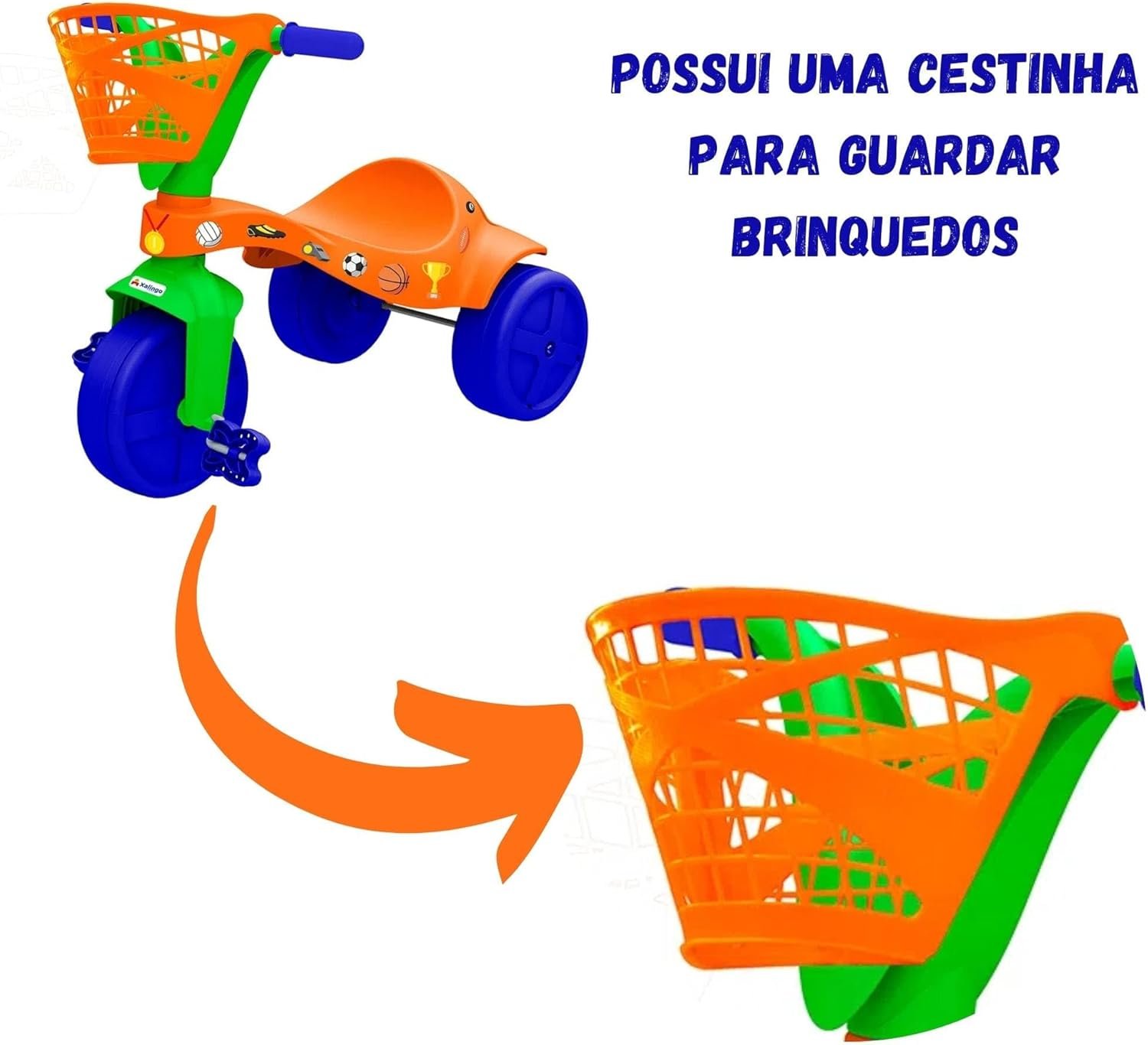 Lindo triciclo em tons de verde e azul, o triciclo Esportes vem com cestinha para carregar brinquedos e lindos adesivos para decorá-lo. Resistente e durável, possibilita as crianças o desenvolvimento da coordenação motora, equilíbrio e atenção.