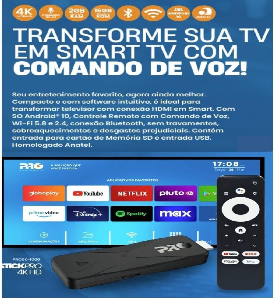 TV StickPro 4K Android TV Proeletronic com 2GB RAM, 16GB, Wi-Fi 5GHz, Bluetooth, Controle Remoto com Comando de Voz