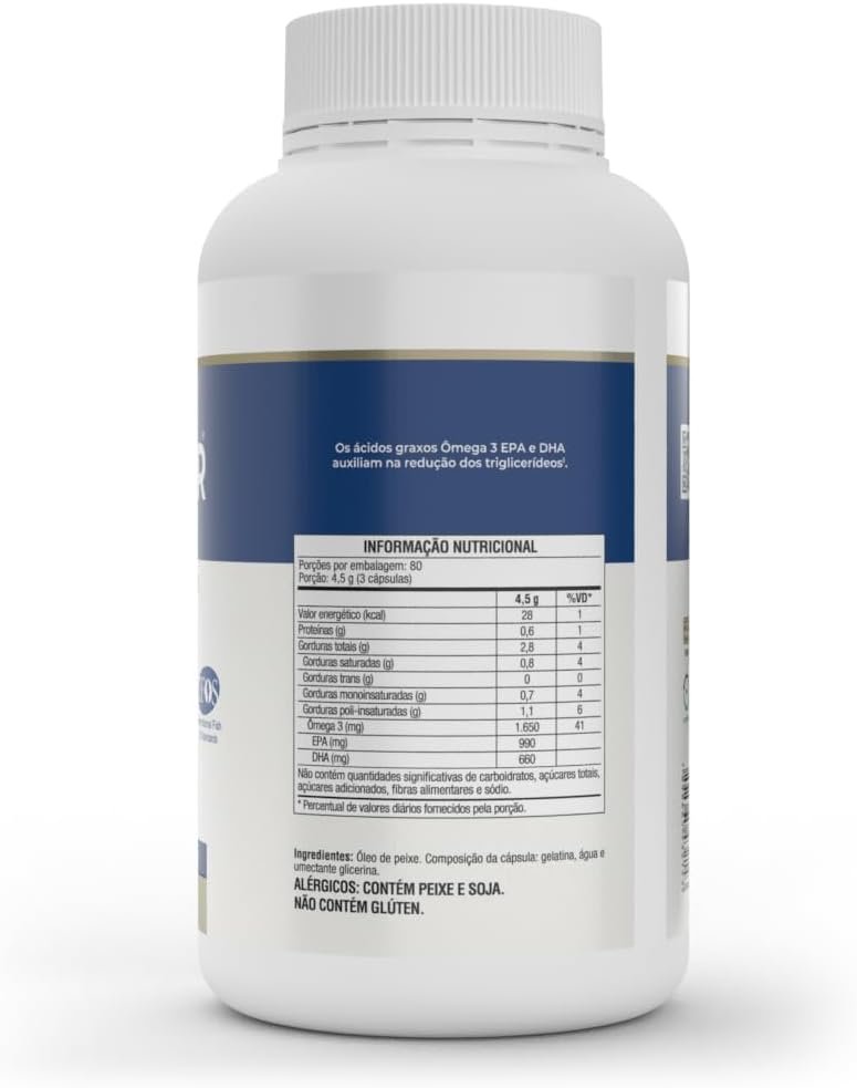 Óleo de peixe (ômega 3) em cápsulas. Produto a base de óleo de peixe extraído de águas frias, profundas e não poluídas, sendo rico em ácidos graxos de cadeia longa, da série ômega 3. Possui alta concentração de seus derivados, ácido eicosapentaenoico (EPA) – 990mg e ácido docosahexaenoico (DHA) – 660mg. Possui a certificação IFOS- International Fish Oil Standards Program. Com certificação do Programa Internacional de Padrões de Óleo de Peixe (IFOS ). Único programa de testes e certificação de terceiros para óleos de peixe. Definindo os padrões mais altos do mundo em pureza, potência e frescor.