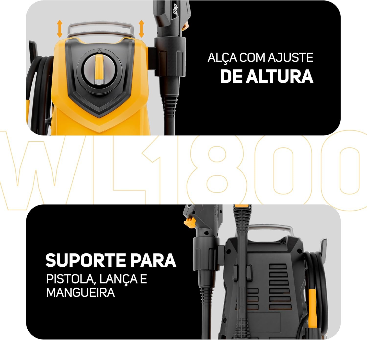 Possui apenas 34cm de altura e uma base firme e estável que evita tombamentos. O tamanho compacto da WL 1800 e a alça com ajuste de altura facilitam o armazenamento e o transporte. A conexão da pistola com engate rápido aumenta a praticidade durante o uso, enquanto os suportes para pistola, baioneta e mangueira ajudam a manter tudo organizado.
